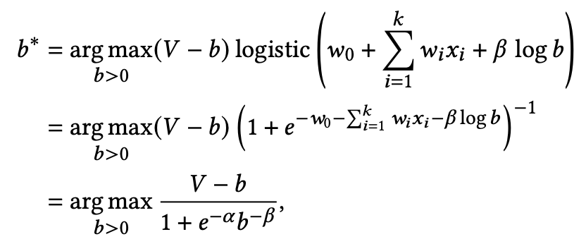 여기서 $F$를 logistic function으로 가정한다. 이제 surplus을 최대화하는 $b*$을 찾는다.