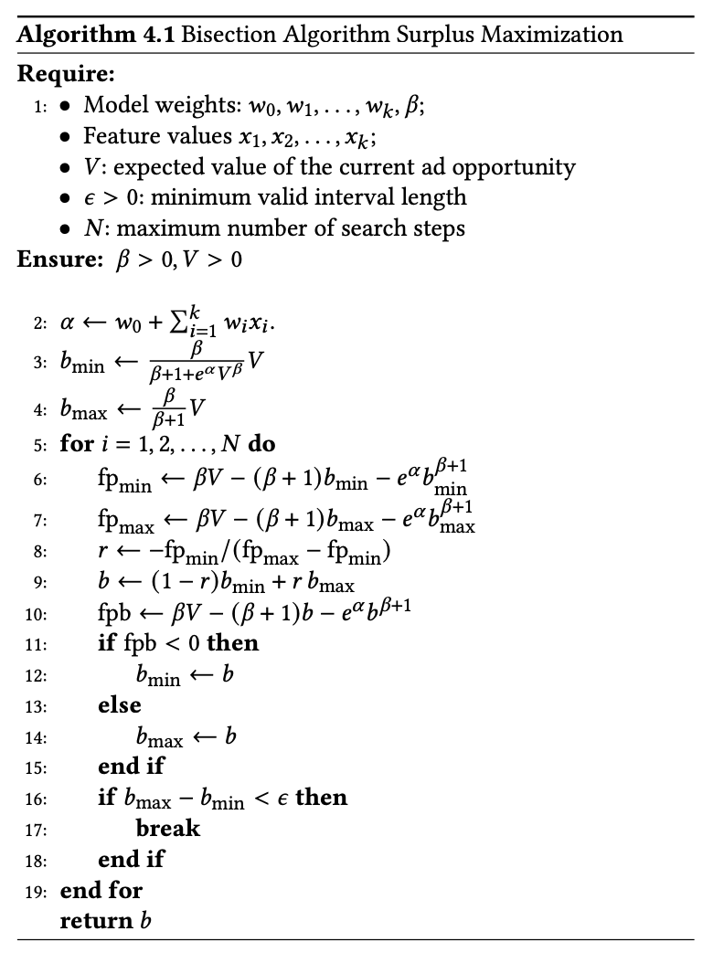 Verizon Media DSP에서 나온 논문이다. censored auction인 상황에서 surplus을 최대화하는 문제를 다룬다. winning price의 cdf을 추정하고 binary search 알고리즘을 통해 이론적으로 surplus을 최대화하는 입찰가(bid)를 찾는다. 아마도 이 논문이 two-step으로 surplus을 최대화하는 입찰가를 찾는 알고리즘을 제안하는 첫 논문인 것으로 보인다.