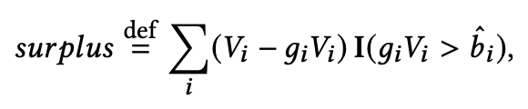 $g_i V_i$가 shading된 가격인데, 이 가격이 $\hat{b}_i$보다 커야 경매에서 이기고, 그 차액만큼 이득으로 가져간다. 모든 경매에 대해서 얻을 수 있는 이득의 합이 surplus이고, 이를 최대화하는 것이 bid shading 문제의 목적이다.