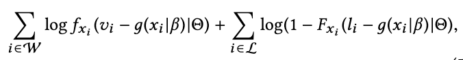censored auction인 경우를 생각해보자. 입찰 가격을 $l_i$라고 하면, $v_i > l_i$임을 알고 있다. cdf 관점에서, $1 - F(l_i)$로 나타낼 수 있다. 따라서 아래와 같이 censored auction인 상황까지 포함해서 loss function을 정의한다.