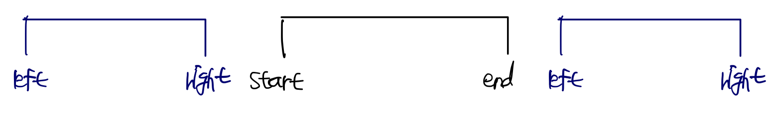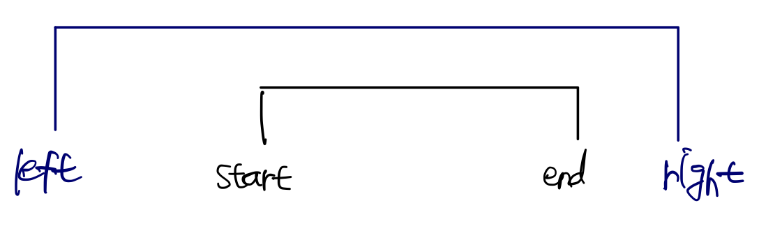 start: 해당 노드가 시작하는 인덱스end: 해당 노드가 끝나는 인덱스left: 부분합을 구하고자 하는 segment의 시작하는 인덱스right: 부분합을 구하고자 하는 segment의 끝나는 인덱스