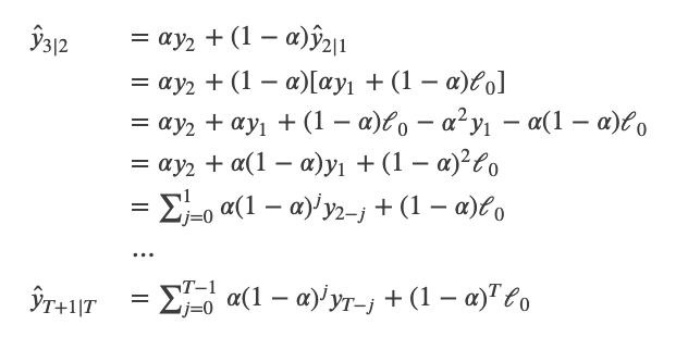 \[ \hat{y}_{2|1} = \alpha y_1 + (1-\alpha) \ell_0 \\ \hat{y}_{3|2} = \alpha y_2 + (1-\alpha) \hat{y}_{2|1} \\ \hat{y}_{4|3} = \alpha y_3 + (1-\alpha) \hat{y}_{3|2} \\ \cdots \\ \hat{y}_{T+1 | T} = \alpha y_{T} + (1 - \alpha) \hat{y}_{T | T-1} \]