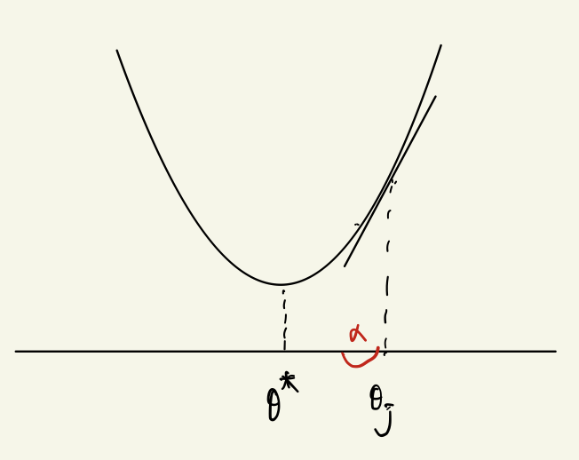 convex cost function을 가정해볼 때, 1차 미분값과 반대 방향으로 움직여야 optimal point에 다다를 수 있다. 위 그림에서 $\theta_j$에서 미분 값이 양수인데, $\theta_j$의 왼쪽으로 가야 $\theta^*$에 도착할 수 있다. 따라서 gradient descent update 정의에서 앞에 -가 붙는 것이다. 또한 얼마만큼 움직일 것인지를 결정하는 것이 $\alpha$이다. 크다면, 한 스탭에서 크게 움직인다.