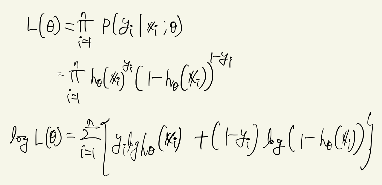 \[ J(\boldsymbol{\theta}) = \sum^n_{i=1} y_i \log h(\mathbb{x}_i) + (1-y_i) \log (1-h(\mathbb{x}_i)) \]