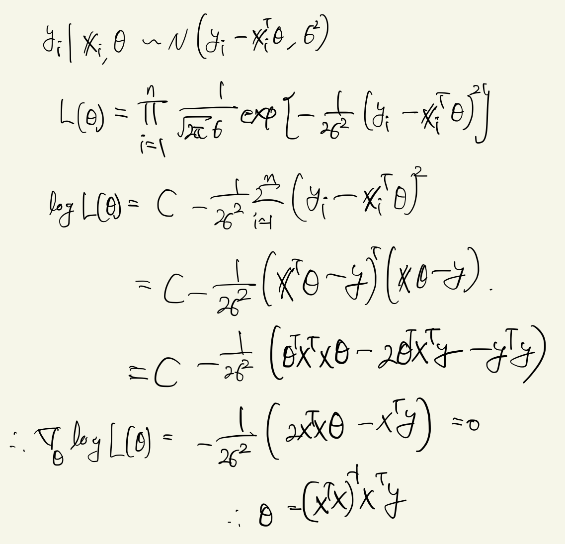 \[ y_i \sim N(y_i - \boldsymbol{\theta}^T \mathbb{x}_i, \sigma^2) \]