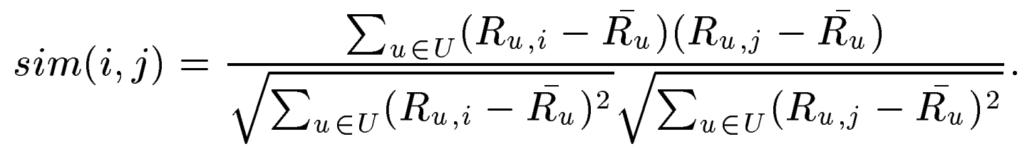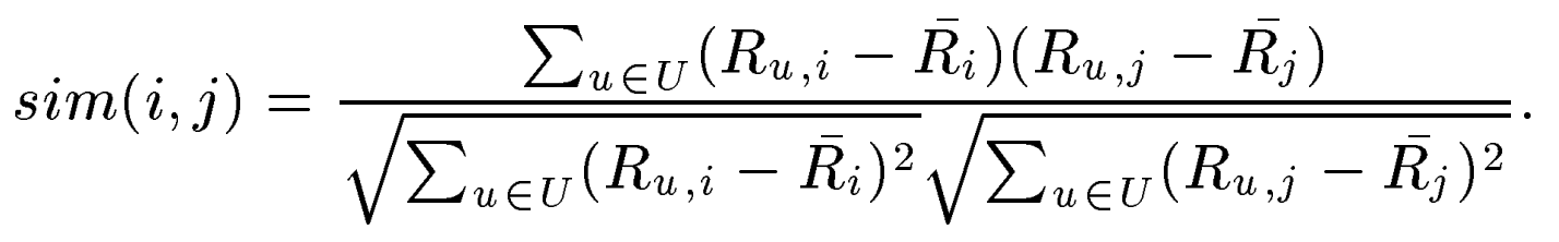 여기서 $U$는 아이템 i,j에 대해 모두 likeness을 표현한 유저이다. $R_{u,i}$는 유저 u가 아이템 i에 대해 표현한 likeness을, $\bar{R}_i, \bar{R}_j$는 아이템 i,j에 대한 평균 likeness이다.