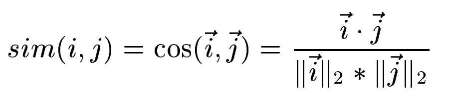 두 아이템 i,j간의 코사인 유사도는 위와 같이 정의된다. 이때 각 아이템 벡터는 m차원이다.