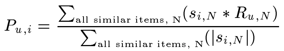 아이템 i와 유사한 k개의 아이템은 앞서 item similarity computation 파트에서 완료했다. 여기서 $s_{i,j}$는 아이템 i,j간에 미리 계산한 유사도이다. 또한 $R_{u,i}$는 유저 u가 아이템 i에 대해 남긴 likeness이다. 이 prediction 값은 active user가 아이템 i와 유사한 아이템들을 어떻게 평가하는지 나타낸다.