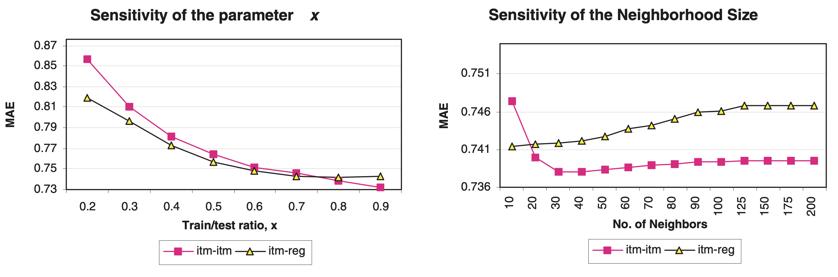 여기서 training이란, 미리 떼어둔 데이터를 사용하여 아이템 i와 유사한 k개의 아이템 간의 similarity score 값을 미리 계산해두는 과정이다. 훈련 데이터 비율이 높을 수록 MAE가 줄어들고, 유사한 아이템을 처음 늘릴 때 MAE가 많이 줄어들었다 (item-item)