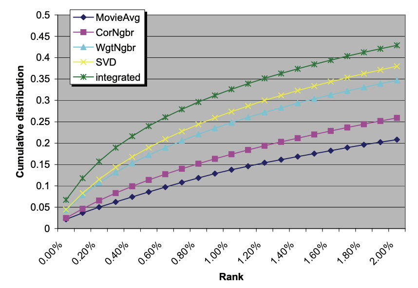 기본적으로 논문에서 제안한 integrated model은 넷플릭스 데이터 세트에 대해 가장 낮은 RMSE인 0.8870의 성능을 보였다. 그러나 이 논문은 단순히 RMSE가 낮은 것이 좋은 품질의 추천인가? 라는 질문을 던진다. 이에 대한 대답을 찾아가는 과정으로, 논문에서는 아래의 평가 방법을 소개한다.