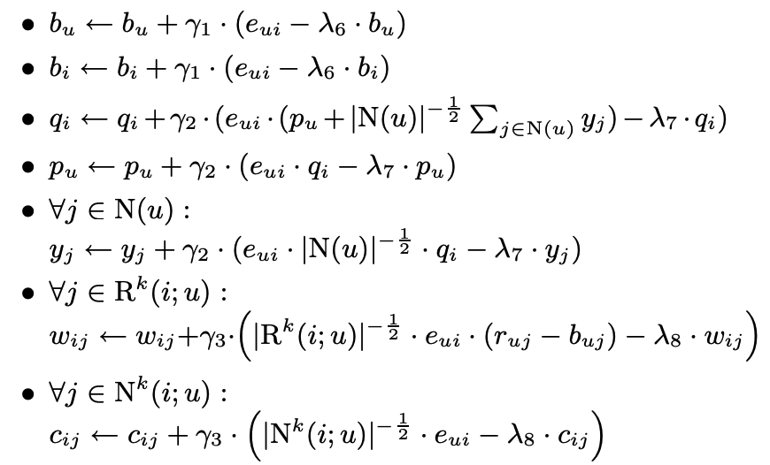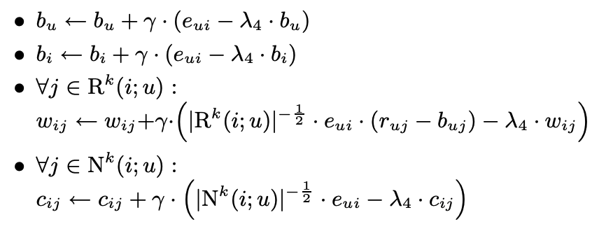 - 만약에 유저 u가 j에 대해 높게 평가한다면, $r_{uj} - b_{ui}$가 높아질 것이고 baseline estimate인 $b_{ui}$에 더해지는 값도 커질 것이다.