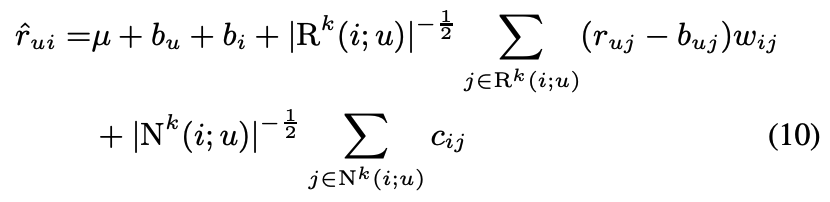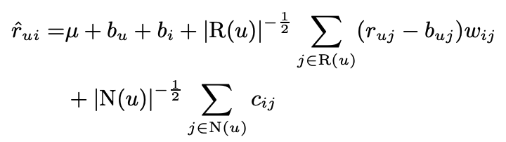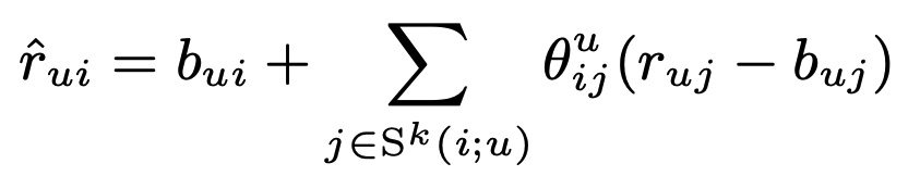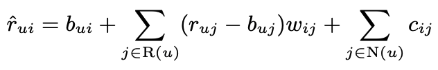 - $\hat{r}_{ui}$는 baseline estimate인 $b_{ui}$가 조정된 채로 $s_{ij}$을 weighted average하여 구한다.