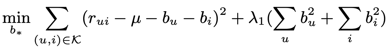 $b_u,b_i$의 추정치는 아래의 sum of squared distances을 최소화하여 구한다.