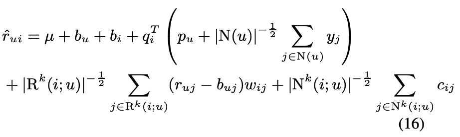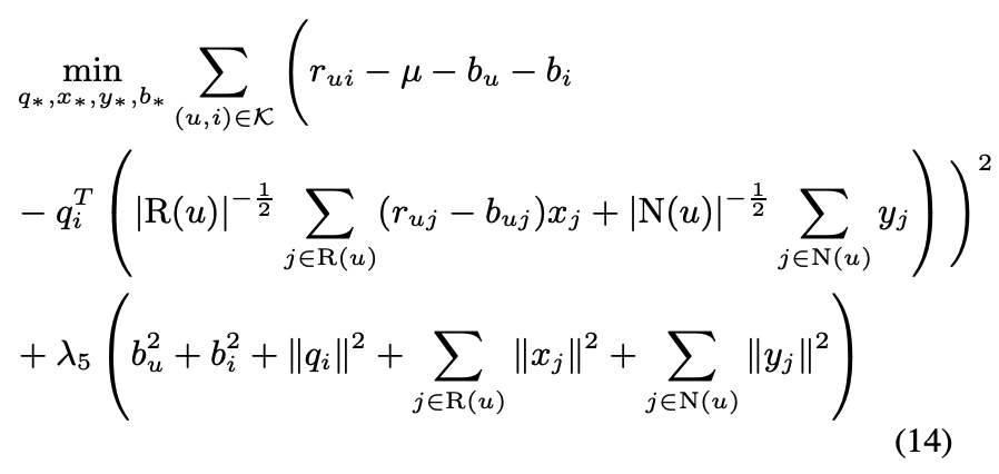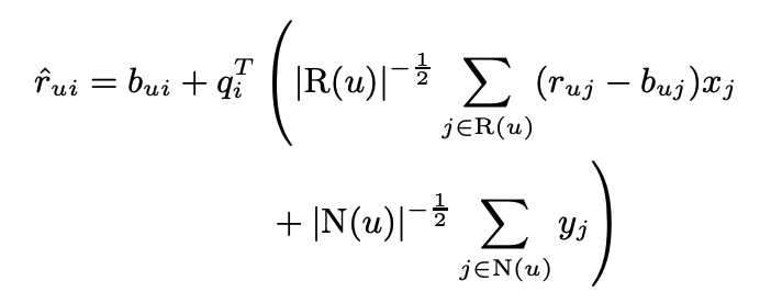 - $q_i^T (p_u + |N(u)|^{-1/2} \sum_{j \in N(u)} y_j)$: 유저벡터와 아이템벡터간의 내적으로, 이 둘의 상호관계를 모델링한다.