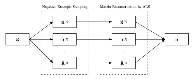 - Phase 1: $\mathbf{R}$에 있는 positive example은 모두 포함한 채로 가정한 확률 분포에 의해서 negative example을 샘플링하여 $\tilde{\mathbf{R}}^{(i)}$을 만든다.