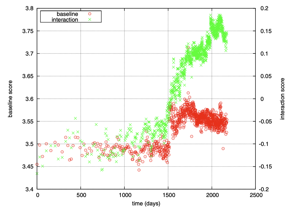 위 그림을 통해 interaction term이 시간이 지남에 따라 증가하고 있음을 알 수 있다. 즉, 입맛에 맞는 영화에 대해 더 좋은 점수를 주고 있다는 것이다. 이는 넷플릭스가 2004년 쯤부터 유저들의 취향을 잘 맞추고 있다고 해석할 수 있다.