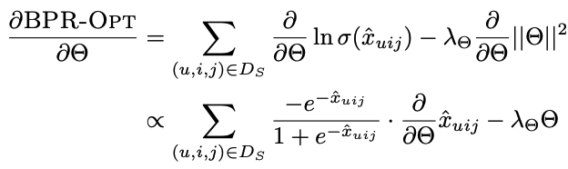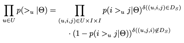 - $D_S$는 implicit feedback에 포함되는 데이터 쌍이다. 앞서 이런 데이터쌍 (i,j)에 대해 아이템 i가 j에 비해 더 선호될 확률을 다음과 같이 정의했다: $p(i >_u j | \Theta)$