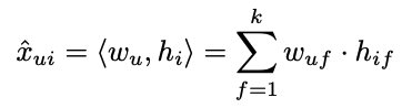 \[ \hat{x}_{uij} = \hat{x}_{ui} - \hat{x}_{uj} = \sum^k_{f=1} w_{uf} \cdot h_{if} - \sum^k_{f=1} w_{uf} \cdot h_{jf} \]