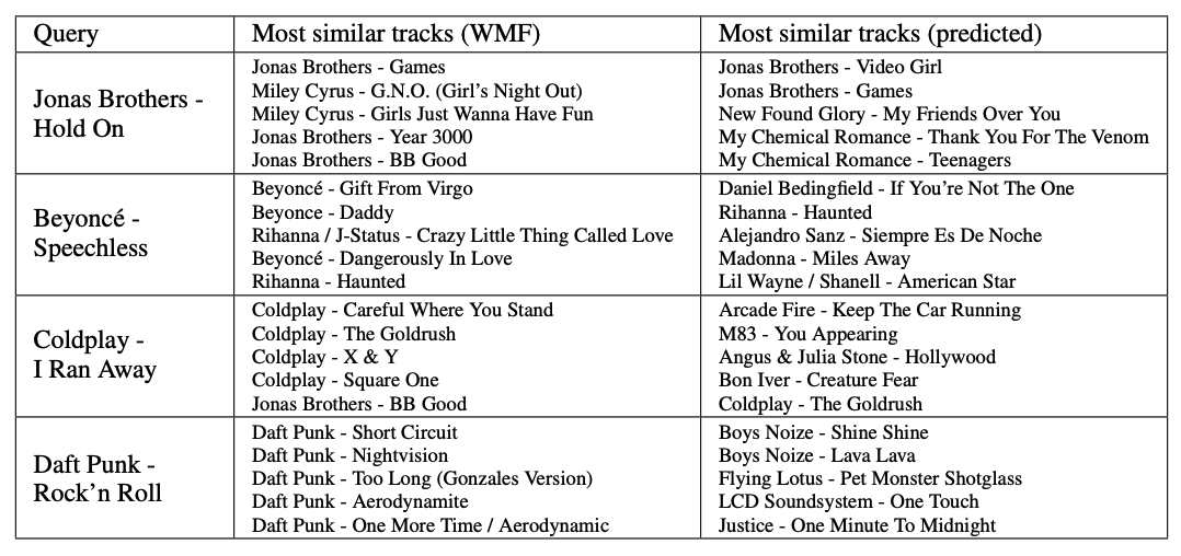- 이해가 안 가는게.. WMF를 ground truth로 하고 cnn을 통해 벡터를 학습했으면, 그 벡터고 WMF와 비슷한 벡터가 나오는 것이 아닌가? 근데 결과가 다르게 나오는 것이 정확히 이해가 가지를 않는다.