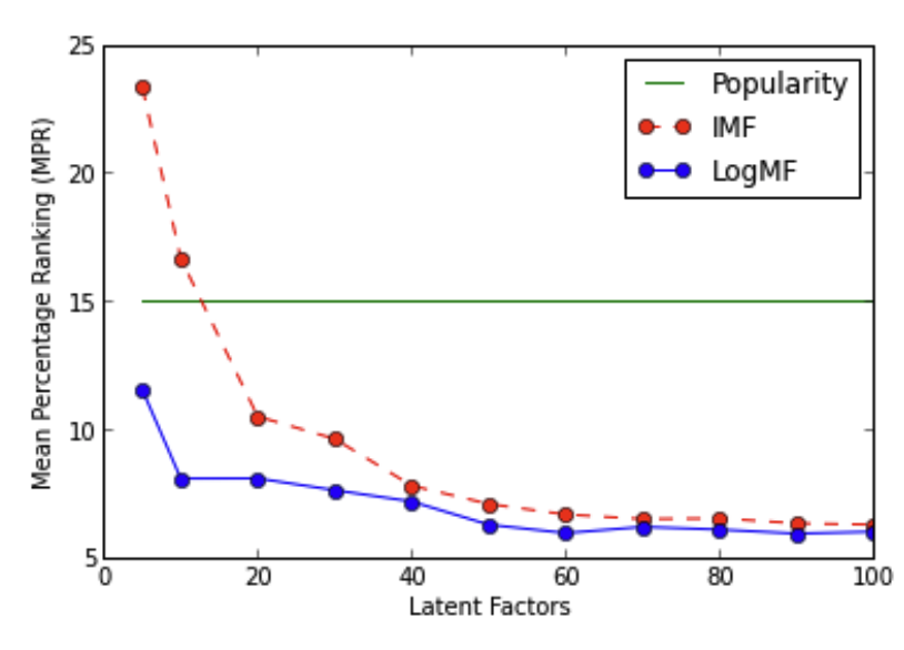 - 작은 latent factor을 선택했을 때, logMF가 IMF에 비해서 월등히 낮은 MPR을 보여 좋은 성능을 보임을 확인했다.
