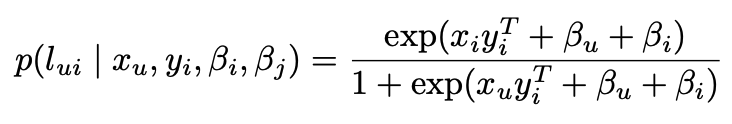 - 맨 처음에는 확률 $p(l_ui | x_u, y_i, \beta_u, \beta_i)$에 대한 베르누이 likelihood인 줄 알았는데 그게 아니었다.