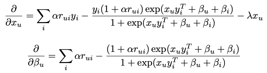 - 유저와 관련된 파라미터 $x_u, \beta_u$을 고정하고 아이템과 관련된 파라미터 $y_i, \beta_i$에 대해 gradient ascent을 진행한다.