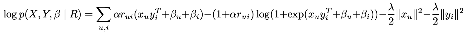- probabilistic approach을 사용하는데, 유저 u가 아이템 i를 선택하는 이벤트의 확률을 모델링하도록 likelihood function을 세운다.