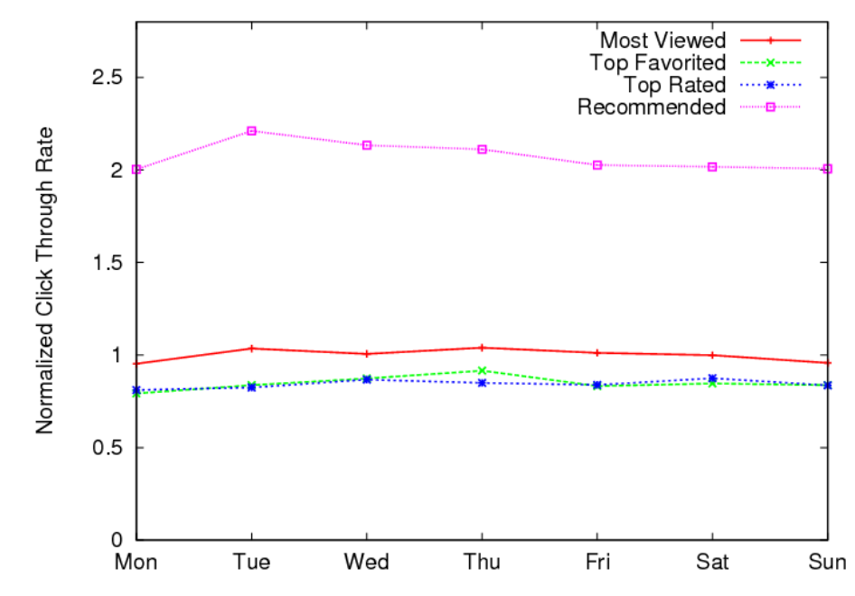 논문에서 제안한 모델과 a) most viewed: 하루에 가장 많이 시청된 비디오 b) top favorited: 가장 많이 유저의 favorites에 추가된 비디오 c) top rated: 하루에 가장 많은 좋아요를 받은 비디오로 추천된 결과와 비교해본다.