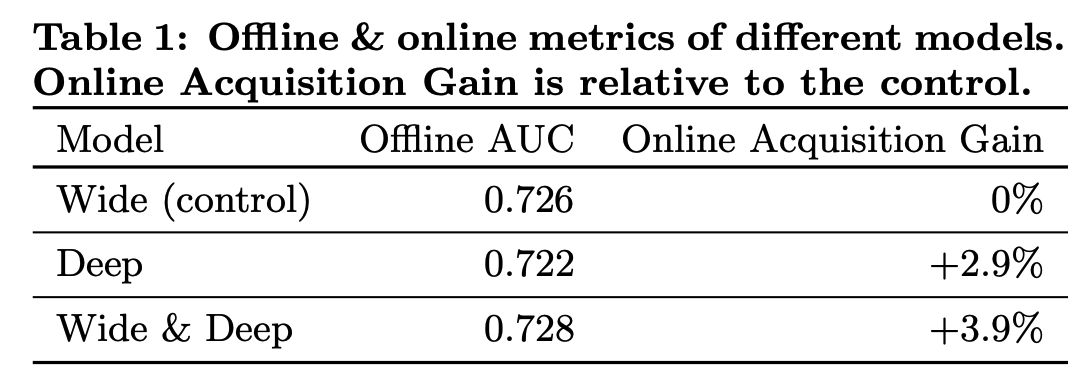 wide & deep network가 offline 실험과 online 실험에서 모두 좋은 결과를 보였다.