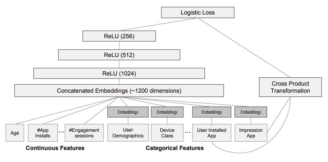 - 굉장히 간단한 딥러닝을 사용한 추천 논문이다. 연속형 변수는 그대로, 범주형 변수는 임베딩을 만들어 넣는 것이 포인트이다.