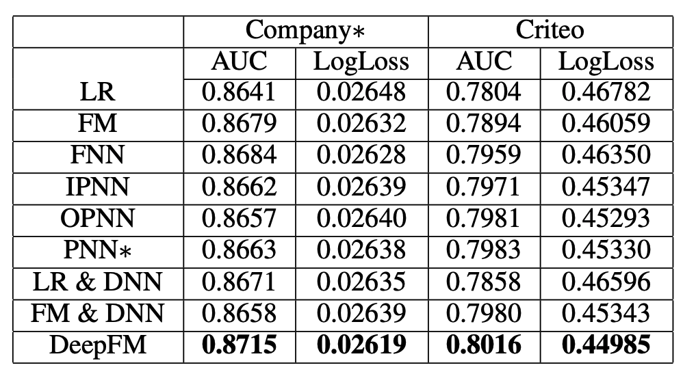 - 두 데이터에서 deepfm의 auc가 가장 높고 logloss도 가장 작다.