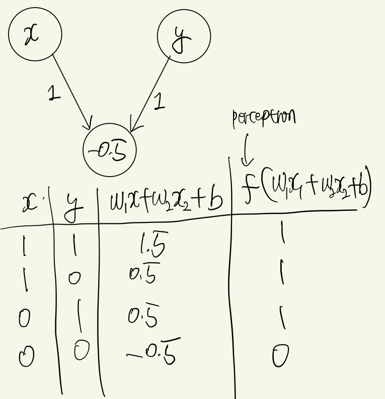 AND 연산과 마찬가지로 SLP을 생각하되 bias을 $b=-0.5$로 둔다. x,y 중 하나만 1이라도 출력값이 1인 것을 알 수 있다. 즉, OR 연산도 SLP로 표현할 수 있다는 것이다.