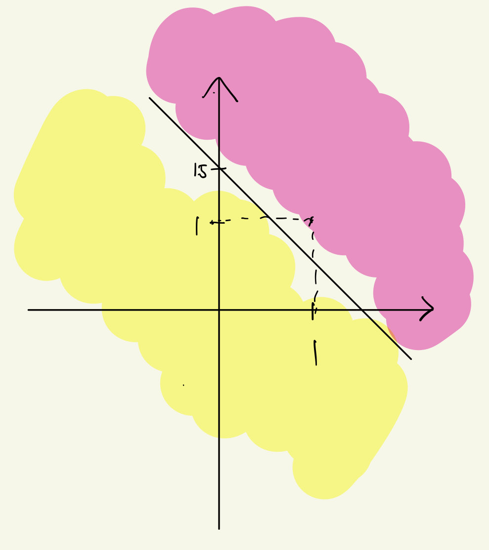 $b=-1.5$로 설정한 경우에 linear function보다 위에 있는 점은 $(1,1)$뿐이고 $(0,0), (1,0), (0,1)$은 모두 아래에 있다. linear하게 2차원 공간이 분리가 되는 것이다.
