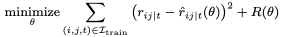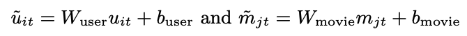 - 유저별로 개인화된 벡터를 생성해야하기 때문에 이후로는 $u_{it}$로 표기하고 영화에 대한 t시점 벡터도 $m_{jt}$로 표기한다.