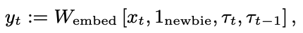 논문에서는 user-state rnn만 설명하는데 movie-staet rnn도 동일한 방식으로 정의되기 때문이다. M개의 영화가 있을 때 t시점의 유저에 대한 벡터를 $x_t \in \mathbb{R}^M$라 하자. 만약에 유저가 영화 j에 대해 k점으로 평점을 매겼으면 $x_{tj} = k$이고 그렇지 않다면 $x_{tj} = 0$일 것이다. 또한 $\tau_t$을 t시점의 wallclock이라고 하고 $1_{newbiew} = 1$은 새로운 유저를 의미하는 값으로 정의하자.