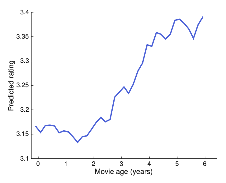 영화 초반 1.5년까지는 평점 예측값이 꺾이다가 그 이후에는 꾸준하게 상승하는 모습이다. 즉, 영화가 오래될수록 평점을 높게 받는 것으로 해석할 수 있다.