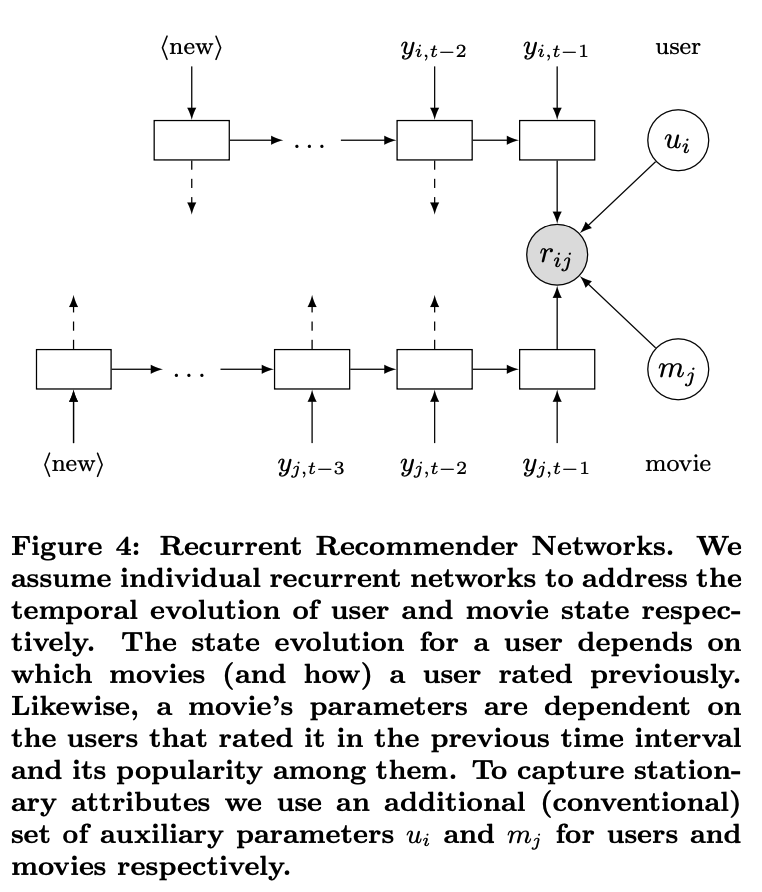 - recurrent recommender network은 기존 모델이 가지고 있는 취약점을 극복하기 위해 모델에 temporal effect을 포함한다.