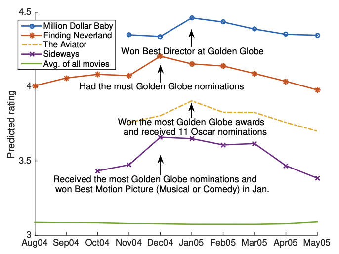 모델이 평점에 영향을 주는 외부 요인을 잘 캐치하는지 알아보는 실험을 진행했다. 위 그림은 각 영화별, 시간의 흐름에 따른 예측된 평점의 변화이다. 각 영화가 외부 상을 받기 이전에 평점 예측값이 올라가는 트렌드를 보임을 확인할 수 있다. 이를 통해 RRN이 외부 변화를 자동으로 감지하고 예측값을 이에 따라 조정하는 능력이 있음을 확인할 수 있다.