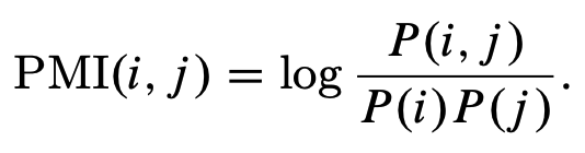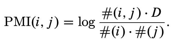 Levy는 skip-gram word2vec과 PMI 행렬의 implicit factorizing이 동일함을 밝혔다. 단어 i,j의 PMI 값은 아래와 같다.