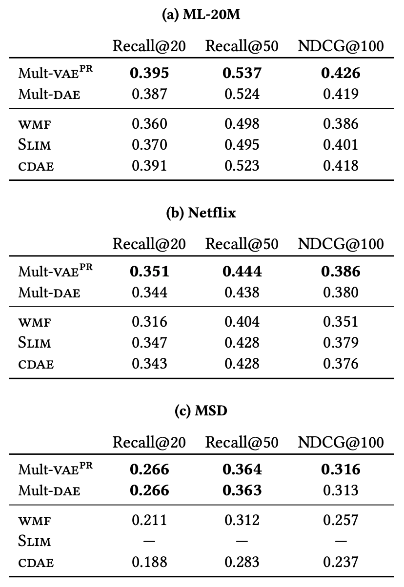- gaussian, logistic likelihood을 사용한 것과도 비교를 해볼텐데 multinomial likelihood을 사용하는 것이 cf 문제 상황에서 조금 더 자연스럽기도 하고 실험 결과, 성능도 더 좋게 나왔다. 따라서 본 논문에서는 multinomial likelihood을 사용한다.