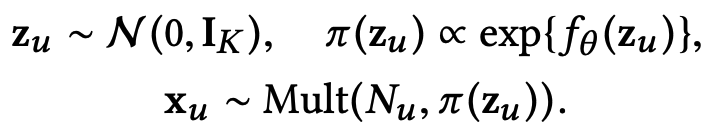 - $Mult(N_u, \pi (\mathbf{z}_u))$: 유저 u의 모든 클릭 수인 $N_u = \sum_i x_{ui}$가 주어졌을 때 $\mathbf{x}_u$는 $\pi(\mathbf{z}_u)$의 확률을 가지는 multinomial 분포에서 샘플링 됐을 것이라고 가정한다.