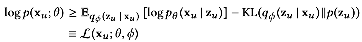 generative 모델을 학습하기 위해 $\theta$을 추정해야한다. 이를 위해 intractable posterior distribution $p(z_u | x_u)$을 근사해야하는데 이때 variational inference을 사용한다. posterior distribution에 대한 근사 분포로 variational distribution을 아래와 같이 정의한다.