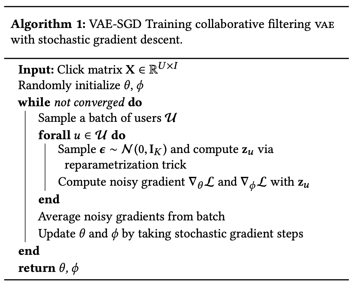 - 한가지 의문점이 드는 것은, mult-vae에서 $\mu_\phi, \sigma^2_\phi$를 어떻게 정하는지이다. 이는 곧 reparameterization trick을 어떻게 사용했는지에 대한 얘기인데 논문에서는 정확히 어떤 함수를 사용했는지 명시적으로 나와있는 것 같지 않아서 아쉬웠다. 이 부분은 저자가 코드를 공개해두었으니 코드를 분석하며 살펴봐야할 것 같다.