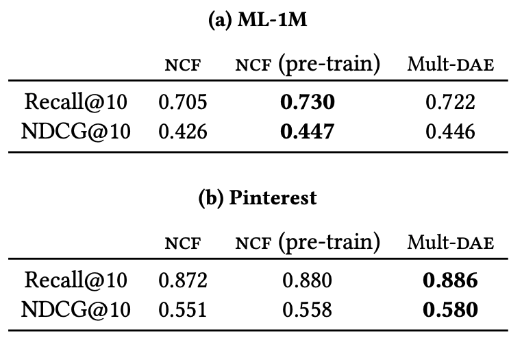 이와 같이 autoencoder을 사용하면 예측시에 $g_\phi, f_\theta$ 함수만 통과시키면 된다. 만약에 mf와 같은 cf 계열에서 훈련 데이터에 존재하지 않은 유저의 클릭 이력이 주어졌다면 어떤 형태의 최적화를 진행해야한다. 다시 말해, autoencoder가 더 빠른 시간 안에 prediction을 할 수 있다는 것이다.