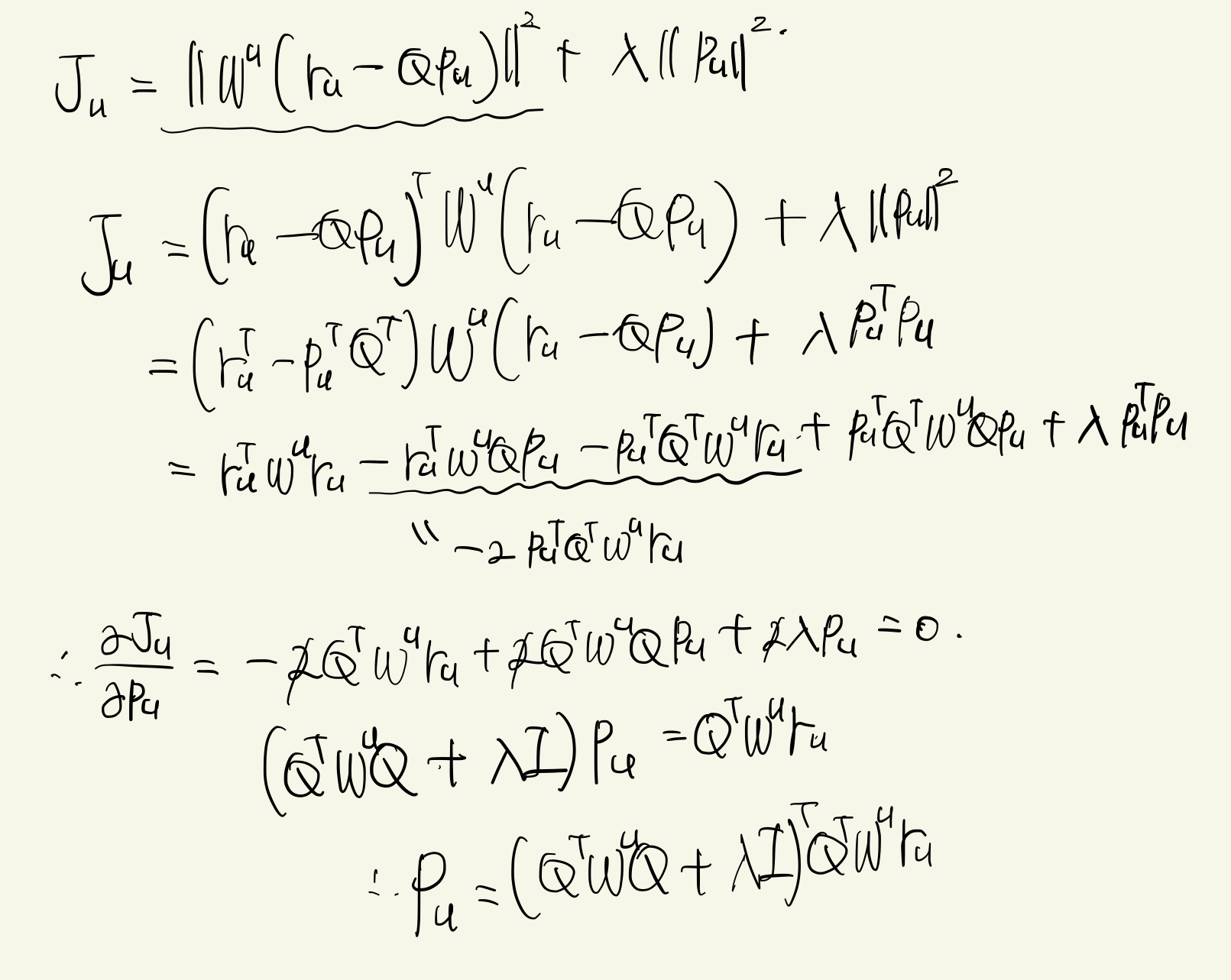잘 보면, weighted ridge regression 형태이다. 즉, $|| \mathbf{W} ( \mathbf{y} - \mathbf{X \beta} ) ||^2 + \lambda || \mathbf{\beta} ||^2$로 바꿔서 생각해보면 이에 대한 해를 아래와 같이 유도하면 된다.