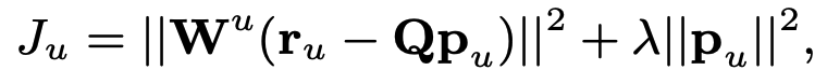 - $w_{ui}$: 유저, 아이템별로 다르게 부여되는 weight이다. 보통 interactions의 횟수에 대한 function으로 정의되는데 confidence라고 불린다.