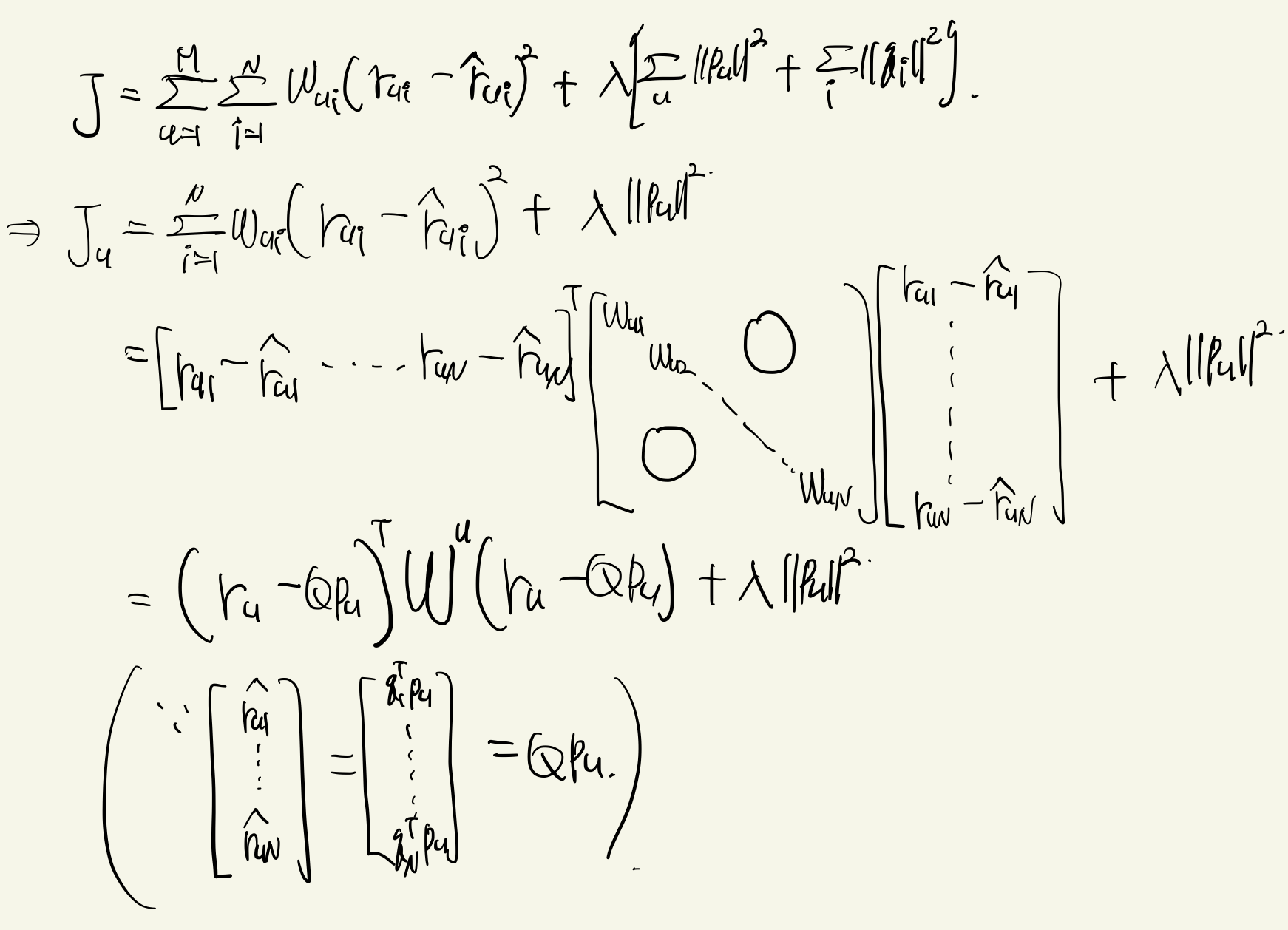 - $\hat{r}_{ui} = \mathbf{p}^T_u \mathbf{q}_i$로 다시 쓸 수 있다.