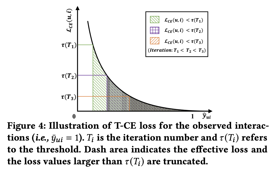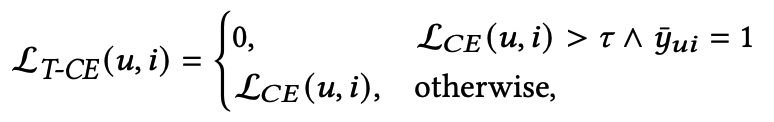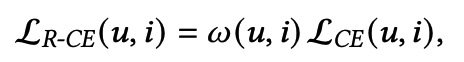 T-CE가 loss 값을 0으로 truncate하는 방법이라면, R-CE는 hard positive interactions의 weight을 조절한다.