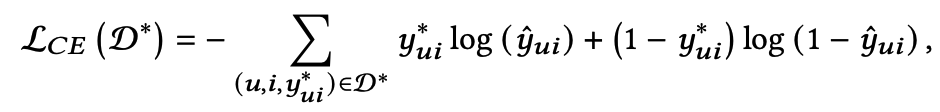 여기서 $y^*_{ui} \in \{ 0,1 \}$은 유저 u가 정말로 아이템 i를 좋아하는지 여부를 나타낸다. 즉, 넷플릭스와 같이 rating 데이터를 의미하는데 보통 이는 얻기가 어려워서 implicit feedback을 사용한다. $\bar{\mathcal{D}} = \{ (u, i, \bar{y}_{ui} ) | u \in \mathcal{u}, i \in \mathcal{I} \}$로 implicit feedback을 구성한다. 여기서 $\bar{y}_{ui}$는 유저 u가 아이템 i와 interaction을 했는지 여부를 의미한다. implicit feedback을 이용한 최적화 식은 $\bar{\theta} = \min \mathcal{L}_{CE} (\bar{\mathcal{D}})$로 정의한다.