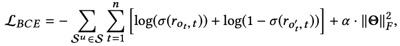 $L$개의 transformer blocks을 쌓으면, 이제 최종으로 우리가 원하는 것을 얻어야 한다. 우리는 기존 n개의 아이템이 주어졌을 때 n+1번째 아이템에는 어떤 것이 올지에 대한 문제를 풀고 있었다. $L$번째 transformer block 후에는 이전 아이템에 대한 attention이 녹아있는 $\mathbf{F}^{L}_t$ 벡터가 나올 것이고 이 벡터를 다른 아이템의 벡터와 내적함으로써 relevance을 구한다.